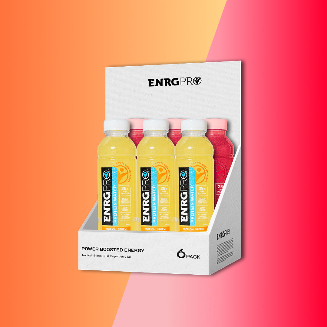 Elevate your fitness routine with ENRG Pro's Protein Water, now in the Power Boosted Energy Pack featuring two exotic flavours: Tropical Storm and Superberry. Each serving is packed with 25g of Whey Protein Isolate (WPI).